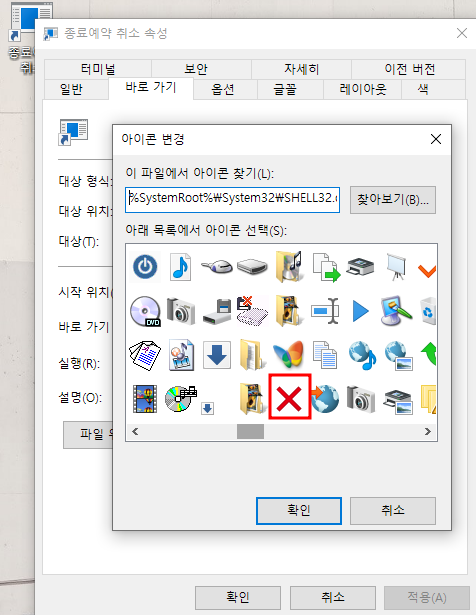 바로가기 탭 하단에 아이콘 변경을 클릭해준 후